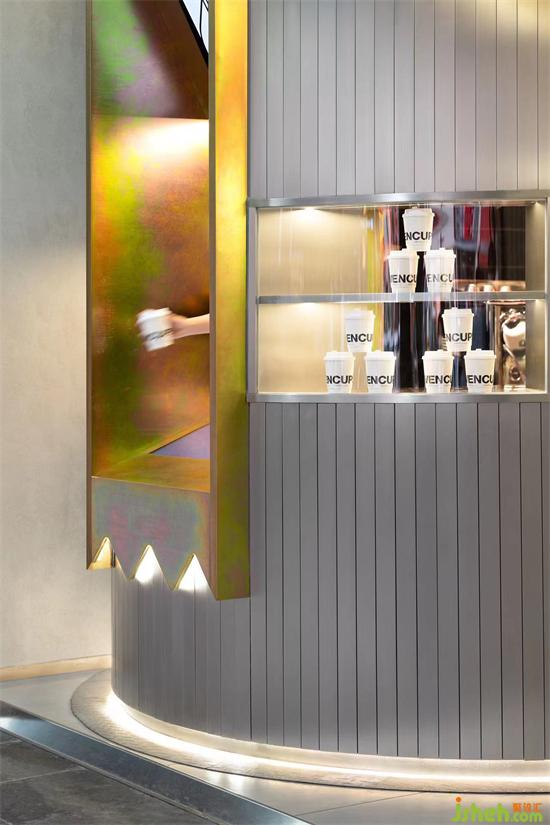 不銹鋼透露著簡(jiǎn)約利落,而彩色的嵌入則提升了整體色彩的豐富度。內(nèi)嵌式的點(diǎn)單場(chǎng)景使得點(diǎn)單操作更具有儀式感和私密感。透過(guò)兩側(cè)小尺寸玻璃視口,顧客能隱約看到操作區(qū)域,引導(dǎo)顧客能把更多關(guān)注放在品牌與享受產(chǎn)品本身上。店鋪設(shè)計(jì)隨視角變化色彩的箭頭符號(hào)始終貫穿全局,并以發(fā)光的形式將點(diǎn)單區(qū)、出杯區(qū)和自助區(qū)依次串聯(lián),讓點(diǎn)單、取杯、自助服務(wù)等一系列動(dòng)作過(guò)度銜接自然,不僅提升店面運(yùn)轉(zhuǎn)效率,也規(guī)避了因?yàn)楣δ軈^(qū)分不清晰而帶來(lái)的混亂和擁堵,保證顧客體驗(yàn)的流暢性,自助開(kāi)放服務(wù)更傳遞了街頭外帶咖啡的松弛感。