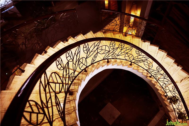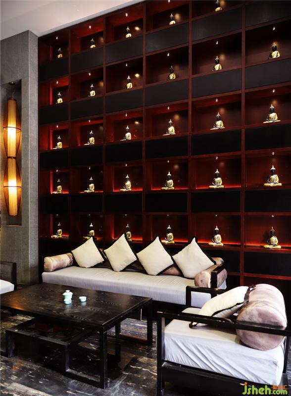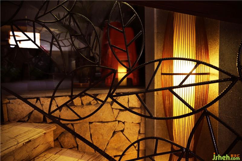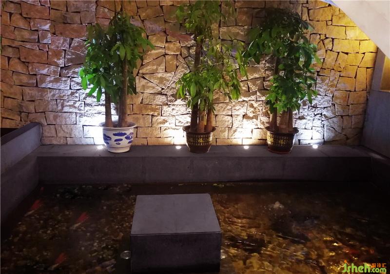 生態(tài)線條旋轉(zhuǎn)樓梯、斧鑿石、蘑菇石、火山石、麻石、魚池、魚缸、腐木、山水畫、草編紙、森林草原秋景、鋼筋焊制樹葉圖形扶手、平頂無吊燈的大堂……還有你佛陀。