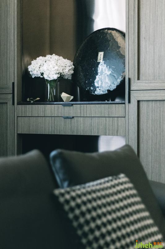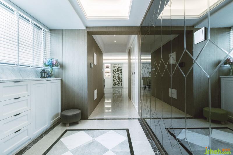時(shí)尚的女業(yè)主鐘愛現(xiàn)代風(fēng)格,也偏愛白色和華麗的視覺效果。而事業(yè)有成的男業(yè)主則喜愛沉穩(wěn)的深色調(diào),愛好茶藝,更偏向于簡約風(fēng)格。色彩的碰撞從玄關(guān)開始。左邊白色的鞋柜與窗戶、墻面自成一體,右邊則是精致的茶色落地鏡。