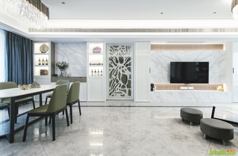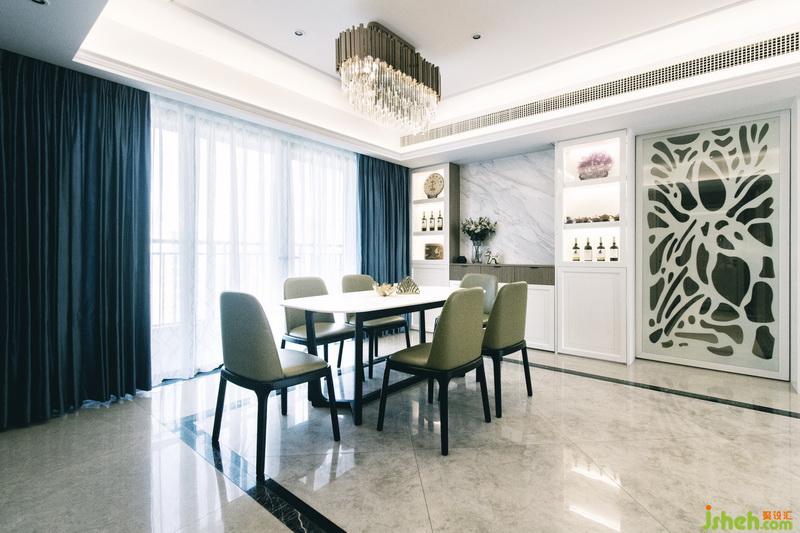 餐廳的大理石紋飯桌、橄欖綠皮質(zhì)餐椅,分別與客廳大理石茶幾和皮質(zhì)沙發(fā)呼應(yīng)。家具的調(diào)性整體統(tǒng)一,視覺上更簡約。