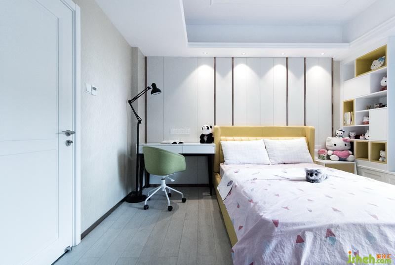 充滿少女心的女兒房。書桌旁高挑的落地?zé)粼鎏韼追终{(diào)皮,另一邊的儲物柜充滿律動感與活潑感,女兒的可愛卡通藏品都集中在這里了。