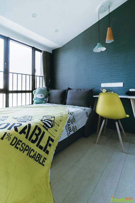 男孩房則以藍(lán)色為主調(diào),搭配黃色的床單、椅子和橙色的吊燈,形成鮮明的色彩對比。我們把原來的飄窗打掉,同時(shí)為了弱化飄窗上的房梁,直接把具有高低差的天花拉直做成斜頂,更添趣味。