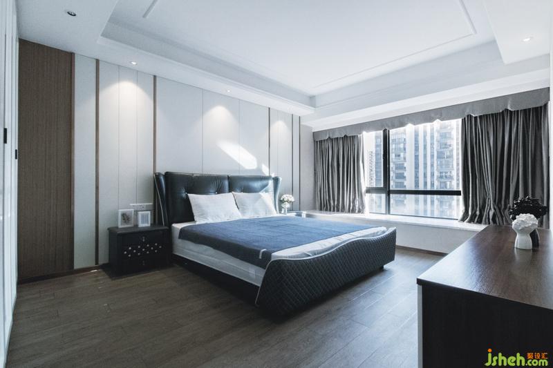 與客廳一樣,主臥整體以白色為主,搭配深色調(diào)的木地板、床具、窗簾等軟裝,平衡了空間的輕重。床背的白色墻面用玫瑰金不銹鋼金屬條進(jìn)行裝飾,簡約中見精致。