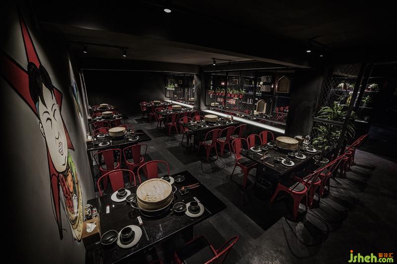 重色調(diào)的大環(huán)境,不但工業(yè)味和酷感十足,還是為了突出餐廳設(shè)計軟裝的精彩。紅色和藍(lán)色是朝鮮民族的代表顏色,因此我們在軟裝設(shè)計上選擇了大量紅色的鐵椅子作為空間的焦點(diǎn)。紅色具有刺激食欲的作用,紅與黑也是既經(jīng)典又具有視覺沖擊力的搭配。獨(dú)立設(shè)計的卡通元素墻繪,呼應(yīng)主題,顏色豐富,不僅點(diǎn)亮了空間,更令原本的酷感中增添了一份童趣。