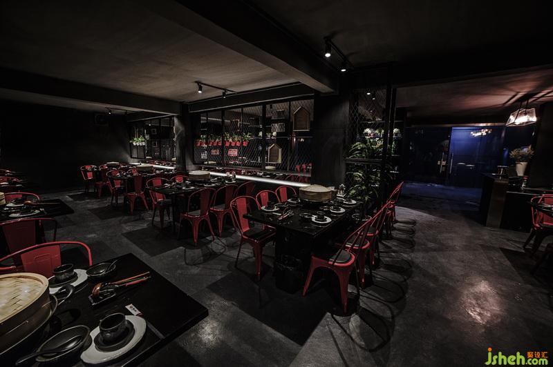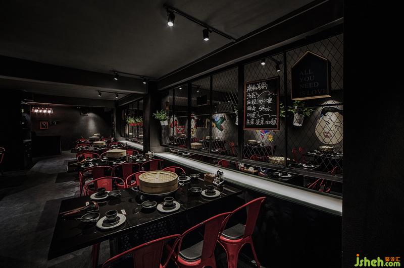 黑色的墻壁,深灰色的天花與地面,如此的重色調(diào)能減少燈光的漫反射,使射燈燈光都集中在餐桌、墻繪、墻飾等精彩之處,戲劇化的燈光效果也讓人視線更有聚焦的重點(diǎn)。