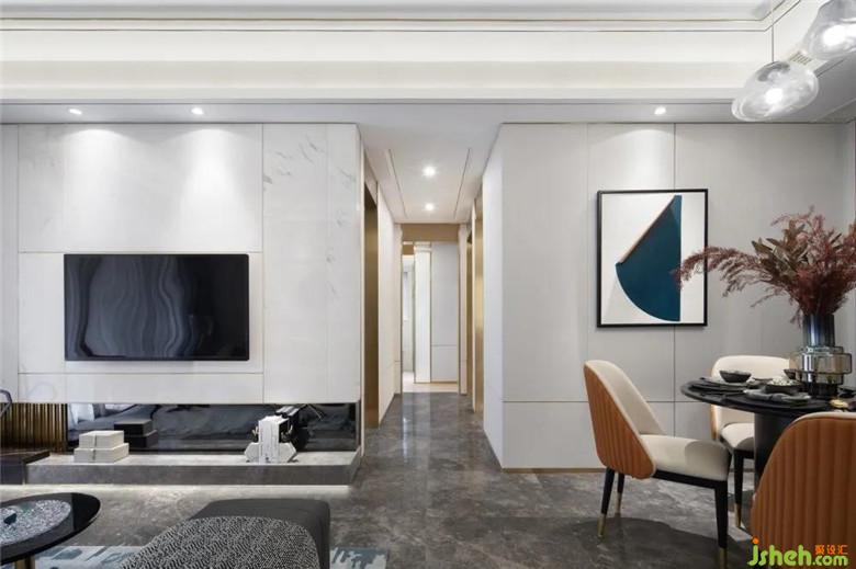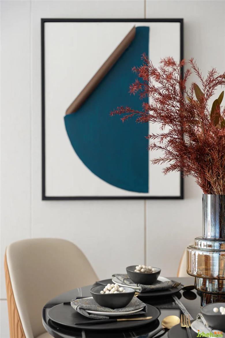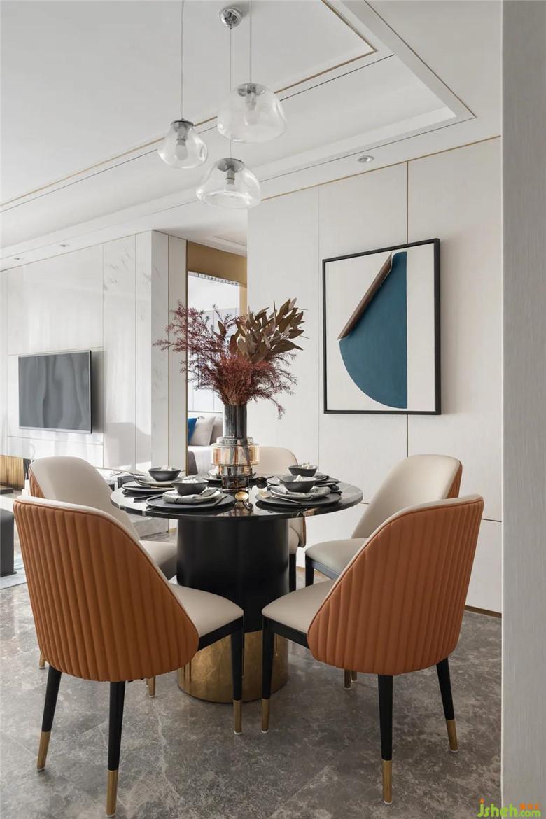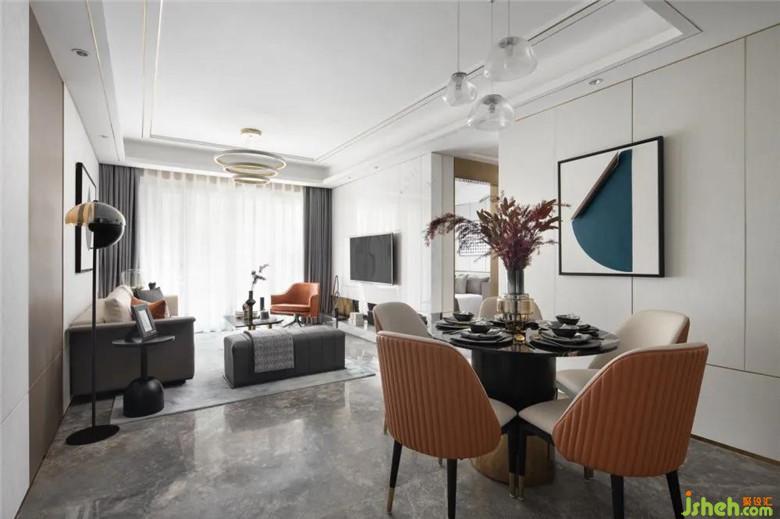 家人的合離,似乎總能通過(guò)食物來(lái)滋養(yǎng)其間的欣喜哀傷,具象關(guān)于生活的美好模樣。用餐區(qū)在以橘色擔(dān)綱起空間本色,墻面的的異性金屬體塊,揮灑空間的時(shí)尚與層次感。