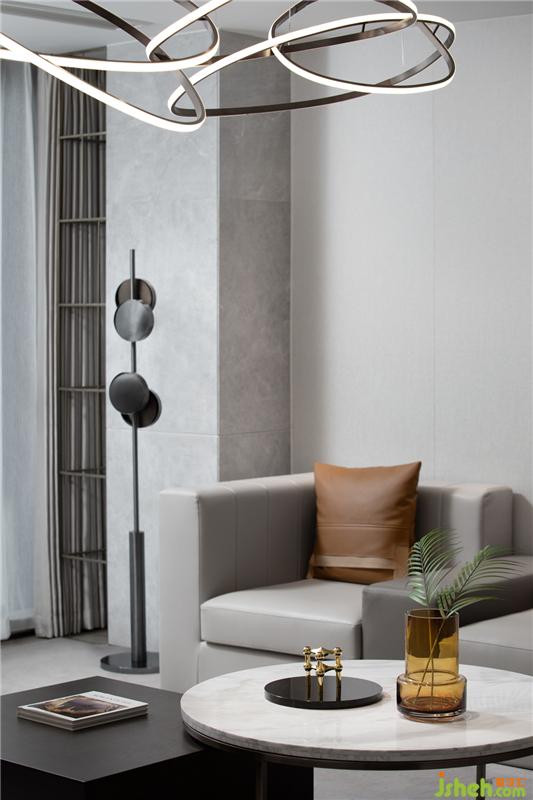 軟式搭配淺色調(diào)皮質(zhì)沙發(fā),塑造空間溫潤的基底,視角凝看天幕,曼妙的流性燈飾流露些許溫情,圍坐于次,從喧囂塵世中抽身片刻,感受靜謐,休憩身心。