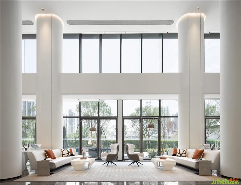 步入洽談區(qū),人們直面的是動(dòng)線明朗的休閑閱讀、洽談品茗區(qū)域?,F(xiàn)代簡約而精細(xì)的美學(xué)搭配,隨著立柱與弧線曲度流動(dòng),形成別具一格的交互體驗(yàn)空間,純凈色彩加以大面積挑空,架梁起繁華都市上的一隅清閑之地,濾盡浮華,內(nèi)心一派舒朗。
