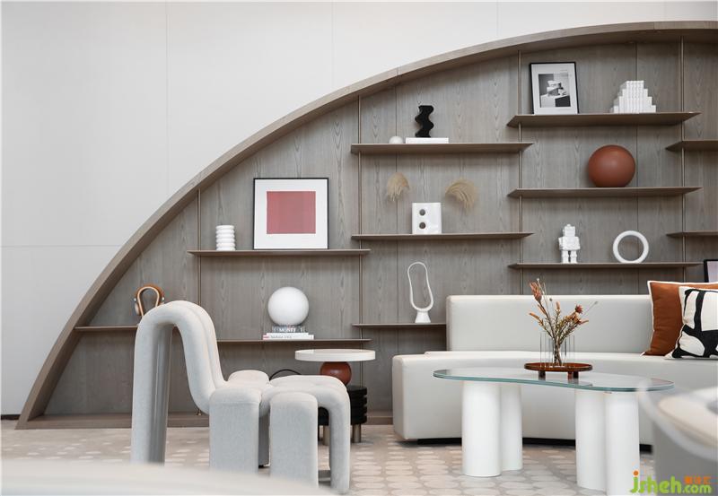 空間好比精神容器,雖然商業(yè)依附在其中,但是情感的營造依舊是設(shè)計(jì)的第一位。在藝術(shù)裝置的甄選上,整體筆觸簡約而純粹,超高的書架依偎在墻邊,使空間變得散漫、輕盈,其下靜坐的小人與長頸鹿指向性得引導(dǎo)人們在此觀賞書籍及藝術(shù)品,娓娓道來的是縈繞在心間的愉悅享受。