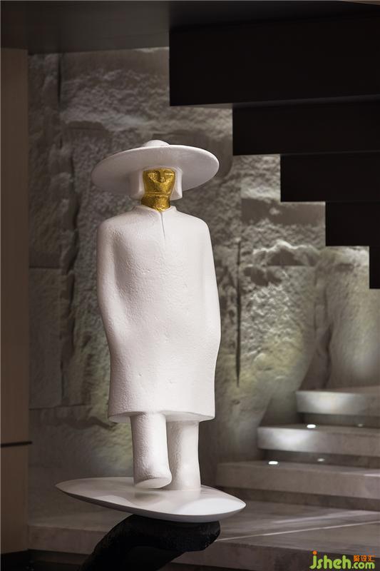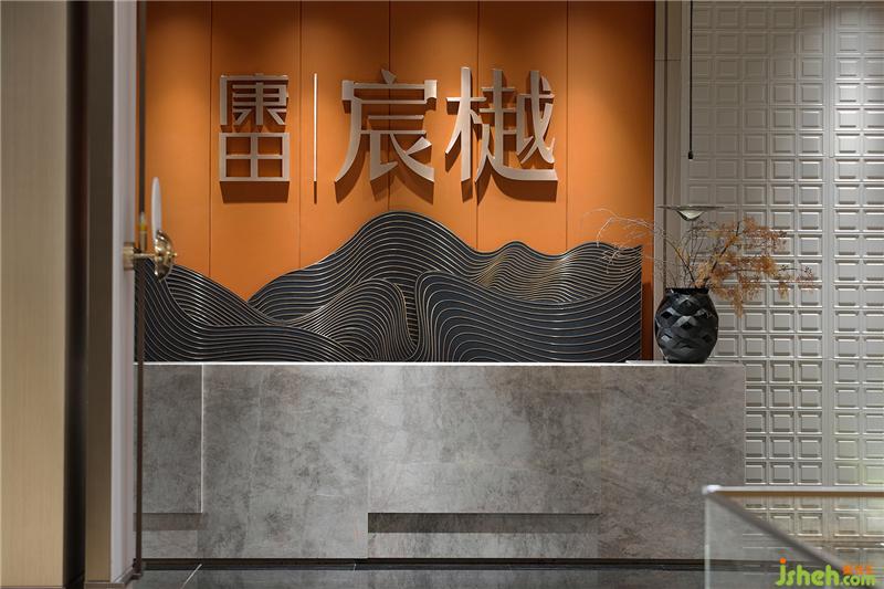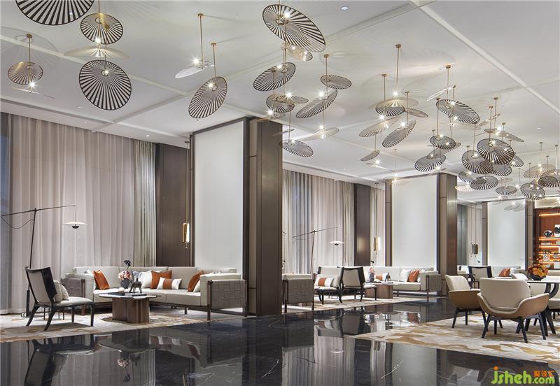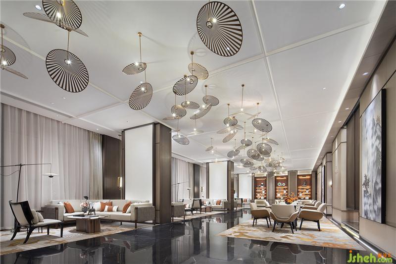 接待廳在濃郁的深境中辟出一絲輕盈之氣,星星點點的藝術裝置如礁石擲入江低,激起層層漣漪,飄飄然般的朦朧感模糊了室內外的界限。
