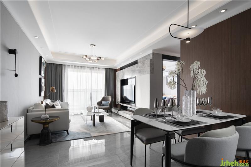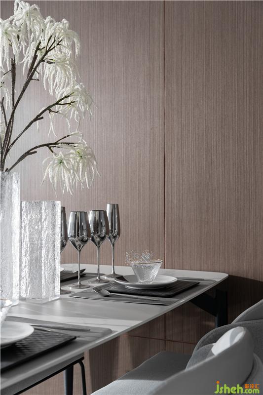 客廳與餐廳相連,餐廳內(nèi)沒有過度強(qiáng)調(diào)色彩的華麗,是洗盡鉛華的故事畫面?;ú萆L,滿室清香,銀制餐具構(gòu)出空間整體品味,簡約實(shí)用的功能體驗(yàn)和精雕細(xì)琢的工藝設(shè)計(jì)被濃縮在取景框里,洋溢著專屬于家人相處之間的浪漫與愜意畫卷。