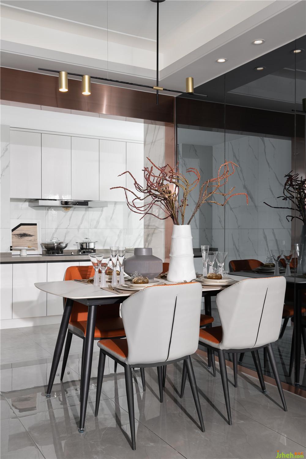 春去秋來,晨昏日暮,餐廳利用光澤的瓷器、餐具編織著屬于這處空間的優(yōu)雅,線性燈飾,簡潔而不失高級(jí),爛漫的紅葉與大面積灰鏡增添了空間趣味感,不中斷夢(mèng)境的延續(xù)......