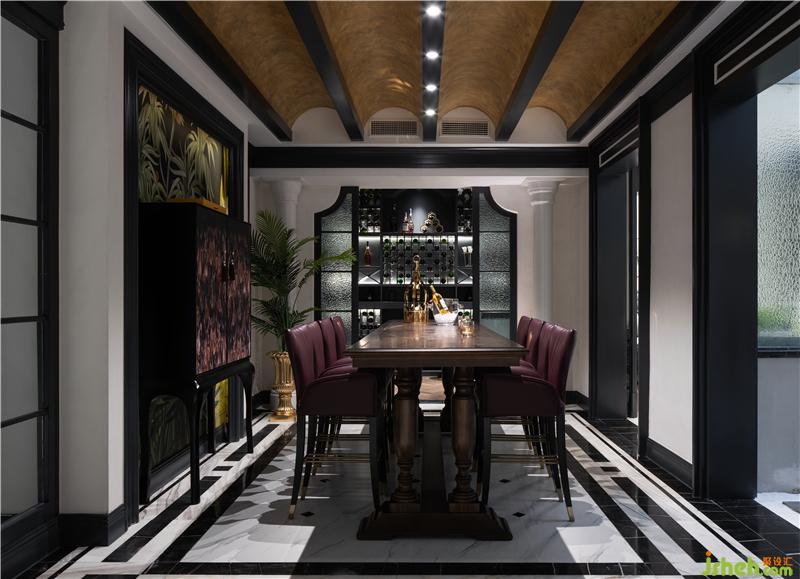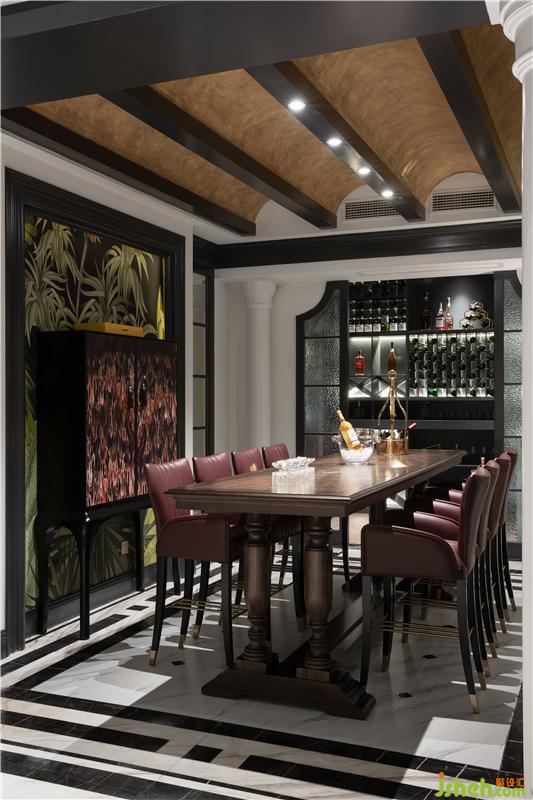 進(jìn)入party區(qū),超挑高法式拱門勾勒大廳的敞闊感,空間恰到好處的線條點(diǎn)綴,產(chǎn)生新與舊的對(duì)話。休閑區(qū)實(shí)用性必不可少,party區(qū)一側(cè)細(xì)致地安排了酒吧區(qū)及酒窖,大面積的黑色搭配,為空間投下一道重彩。