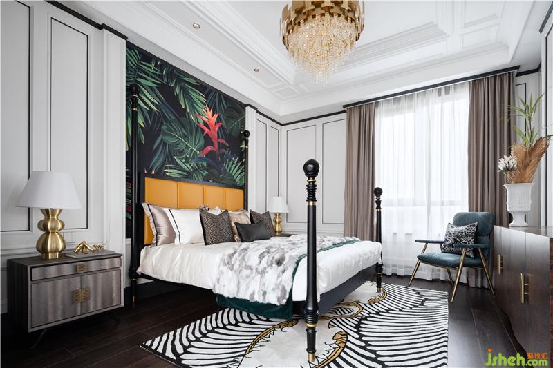 溢美之詞繼這處氣質(zhì)空間溢出,墻面裝飾植物背景,自然與空間的美感融合一體,近景遠(yuǎn)景都有美的存在。沉穩(wěn)深藍(lán)與高級(jí)黑搭配,演繹衣帽間專屬優(yōu)雅,點(diǎn)綴的金屬跳躍在空間中,增添一絲時(shí)尚與輕奢。