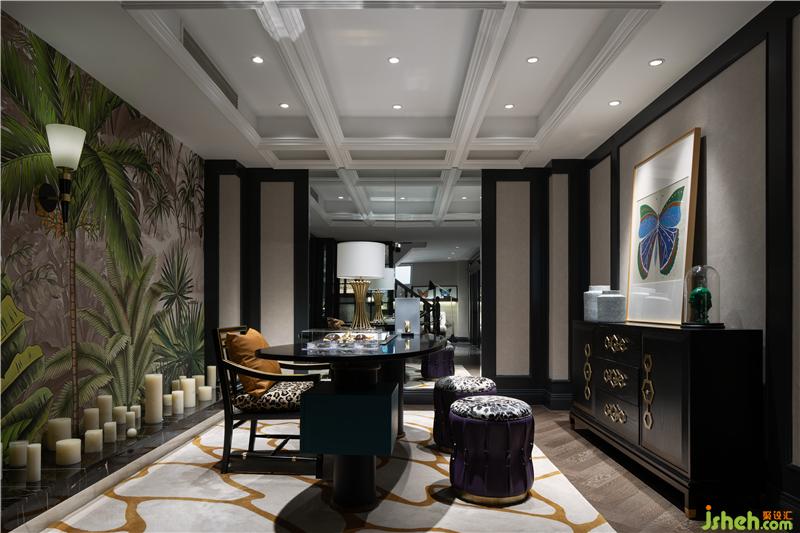 溢美之詞繼這處氣質空間溢出,墻面裝飾植物背景,自然與空間的美感融合一體,近景遠景都有美的存在。沉穩(wěn)深藍與高級黑搭配,演繹衣帽間專屬優(yōu)雅,點綴的金屬跳躍在空間中,增添一絲時尚與輕奢。