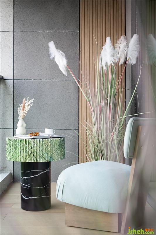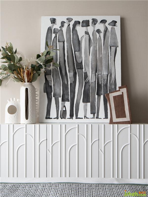 這里還陳列著主人愛好的抽象藝術(shù)畫作,調(diào)皮的小貓、連續(xù)的水平線條理性而優(yōu)雅,具有強(qiáng)烈的秩序感。入戶右邊的茶室,充滿了儀式感,樣板間軟裝設(shè)計透明的置物架在陽光下散發(fā)著熠熠的小光芒,那些看似平凡尋常的小器物擺放在一起,給觀看者提供了喚醒給予世界另種解釋可能性的機(jī)會。同時,空間又可根據(jù)使用者,功能變化,可以是直播工作間,客房,書房,花房等等承載生活。