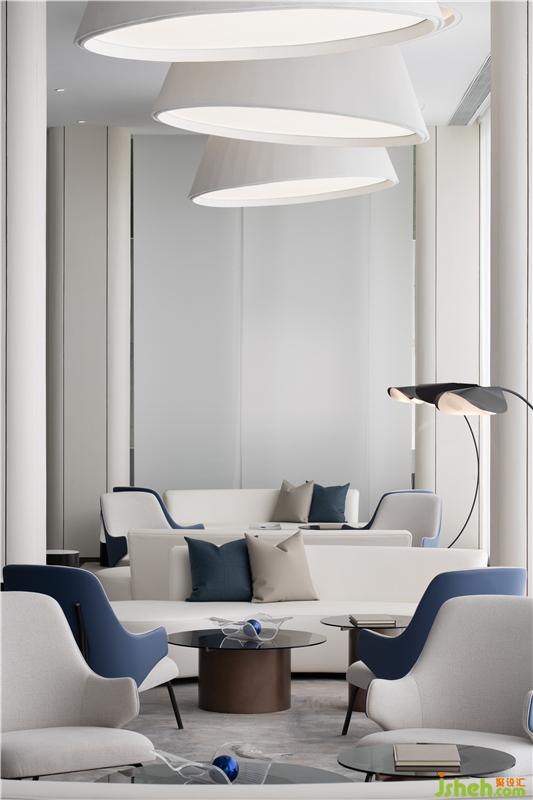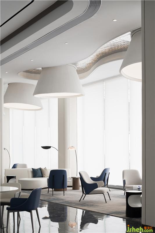 洽談區(qū)以對稱的構造交互、流動的空間內外部關系,以及水波紋不銹鋼吊頂來反射光的紋路,來加深場地本身給予人通達五感的多樣體驗,并以此形成了空間內部的敘事邏輯。