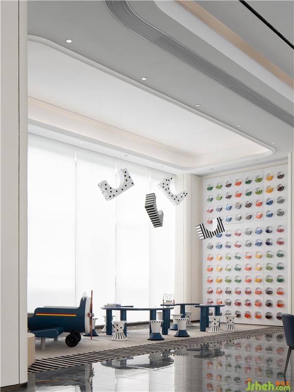 兒童區(qū)的懸浮積木裝置別出心裁,呼應可互動的樂高積木,再基于審美與藝術中的內省體驗、直覺感情的發(fā)散表達,梳理出整齊劃一的氛圍,臨窗一側,整面落地的玻璃窗,消除了室內外的邊界限制,在此交換感知。