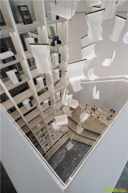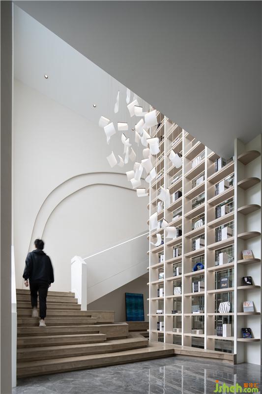 轉角的通天書架搭配書頁形狀的燈飾,在自然質感的空間中相互呼應又彼此消化,以一種精神性的致敬,共同成為空間無限“延伸”的力量來源。