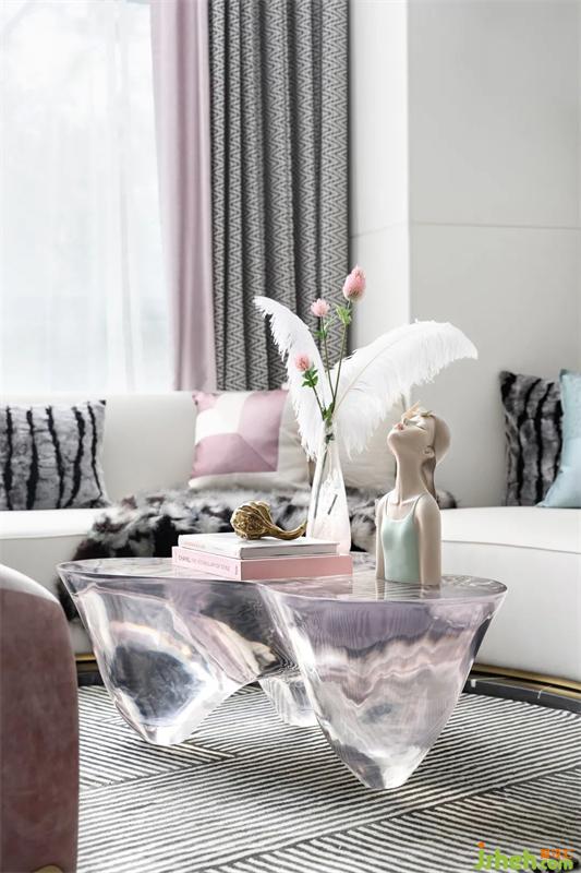 那盞垂在空中的燈飾散著柔和氣息,茶幾水晶三角底座的設(shè)計(jì)別出心裁,輕幽而有靈氣,添增想象與趣味的藝術(shù)語言。