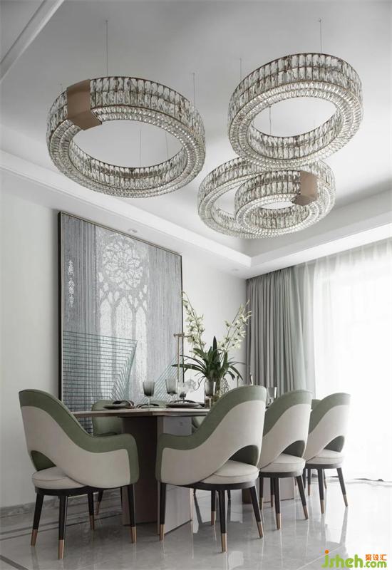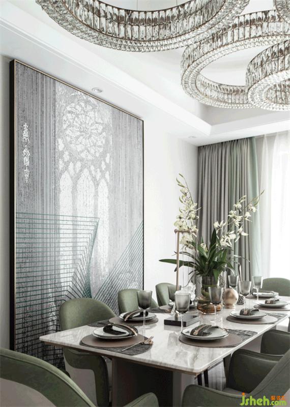 精雕細(xì)刻餐具與暗色金箔吊燈,串聯(lián)起空間靜謐、冷峻的氣息,牛油果綠給人無限的遐想,給予空間溫暖的觸感,秩序井然又不失溫度。