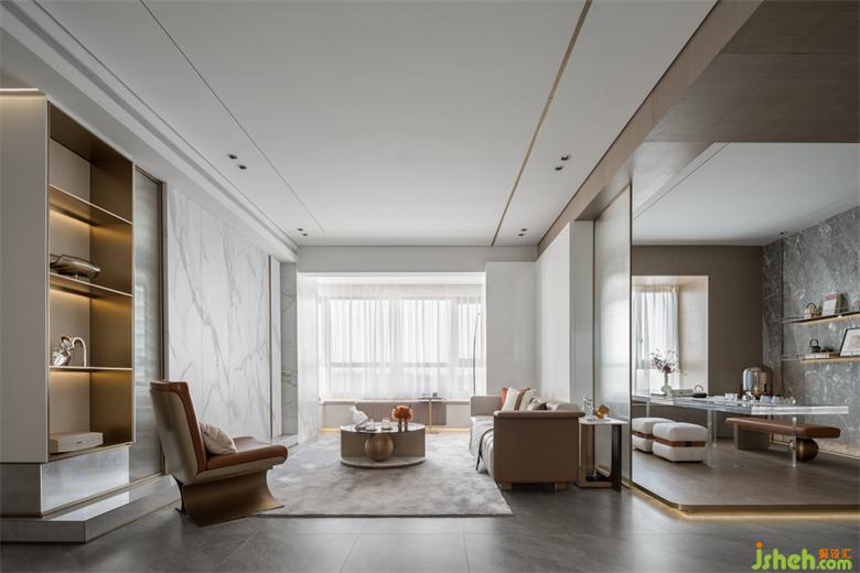 懸浮透明的茶幾,為茶室增添了幾分浪漫色彩,去貼合目標(biāo)人群閱歷世界之美后的靜謐安然。樣板房設(shè)計(jì)設(shè)計(jì)于人的體驗(yàn),同樣是有顏色、有聲音、有味道,喚起內(nèi)在的精神共鳴。單是風(fēng)格色彩,就結(jié)合了意式的簡約、宋式的簡省,透射出奢華的淺色、淡雅的白。