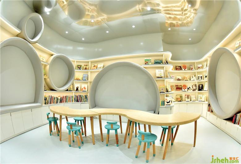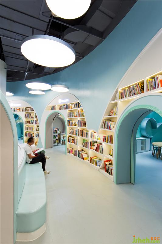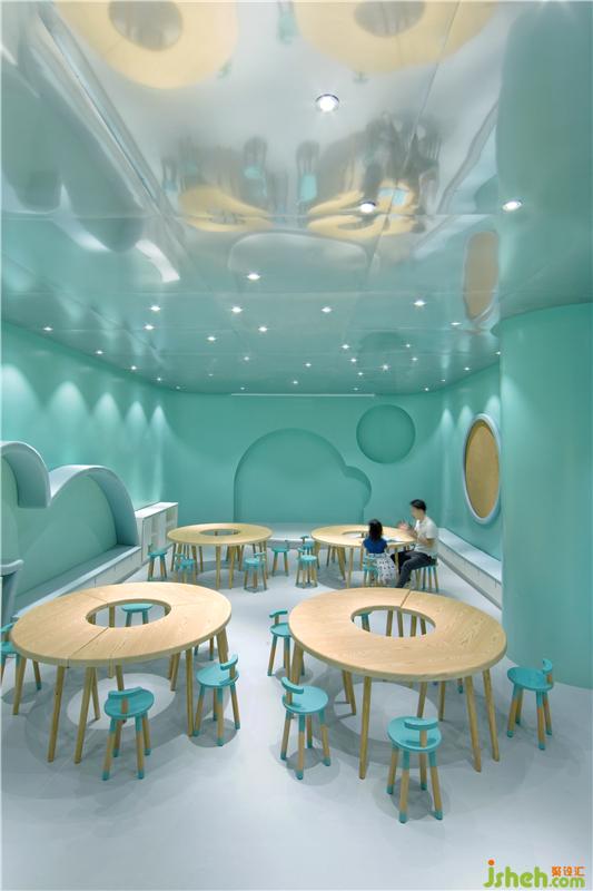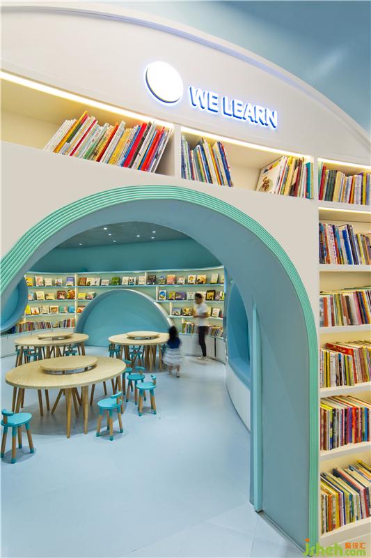 在第二個空間,圓頂沉浸式劇場設(shè)置了360度投映,家長和小朋友可以在內(nèi)一起感受多媒體互動學(xué)習(xí),聽講座,辦讀書會,并且還可供會員開展兒童生日派對。兒童書店設(shè)計圓頂劇場被多用途兒童教室和全日制親子餐廳包圍,為父母提供專門的休息區(qū)域可供交友,放松,談話等活動,除此之外,更是貼心地為大家準(zhǔn)備了烘焙教室,使得孩子可以和父母一起體驗烘焙的樂趣。其中采用明黃色和嬰兒藍的半開放式教室是為了讓孩子們放松心情,消除與教師之間緊張的相處模式,在良好舒適的環(huán)境中激發(fā)出他們的學(xué)習(xí)興趣。