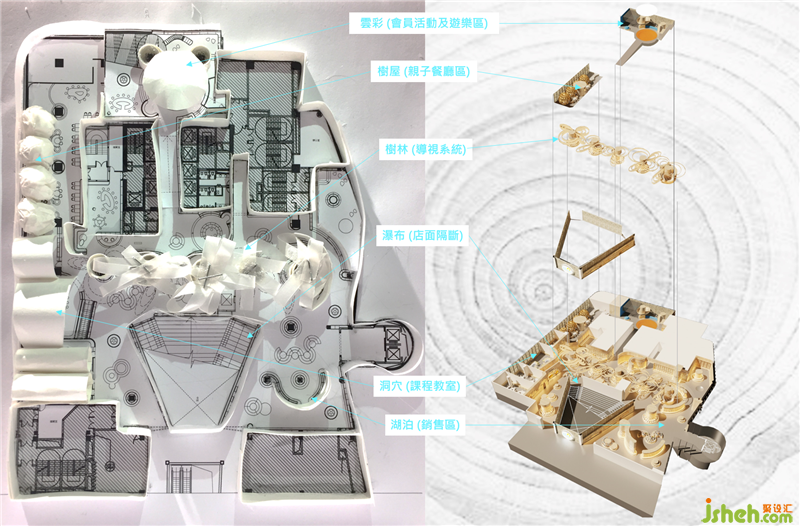 整個(gè)兒童書店設(shè)計(jì)空間圍繞住中間的亮點(diǎn)是浮在天空上面巨型的發(fā)亮花瓣造型,在不同的區(qū)域都能夠識(shí)別它們的方向感,從而達(dá)到標(biāo)志系統(tǒng)的功能。