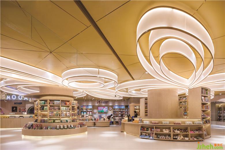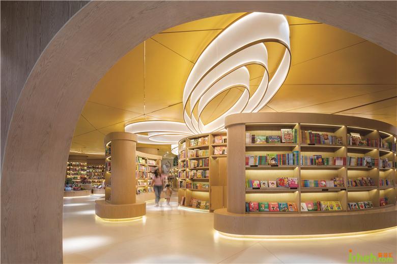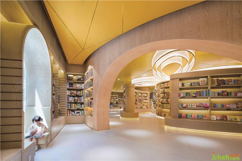 零售區(qū)域是一個(gè)售賣兒童繪本,圖書和文具等不同類別產(chǎn)品的一個(gè)人性化空間,溫暖的色調(diào)由天花的黃色和全高木皮的墻體和書柜所創(chuàng)造。在不同的曲線組合上面我們創(chuàng)造了有開放式和私密式等不同的閱讀區(qū)域,加上自然光線所賦予的一些閱讀窗口,給父母和兒童一起在這個(gè)零售空間中沉淀心靈和專心閱讀。