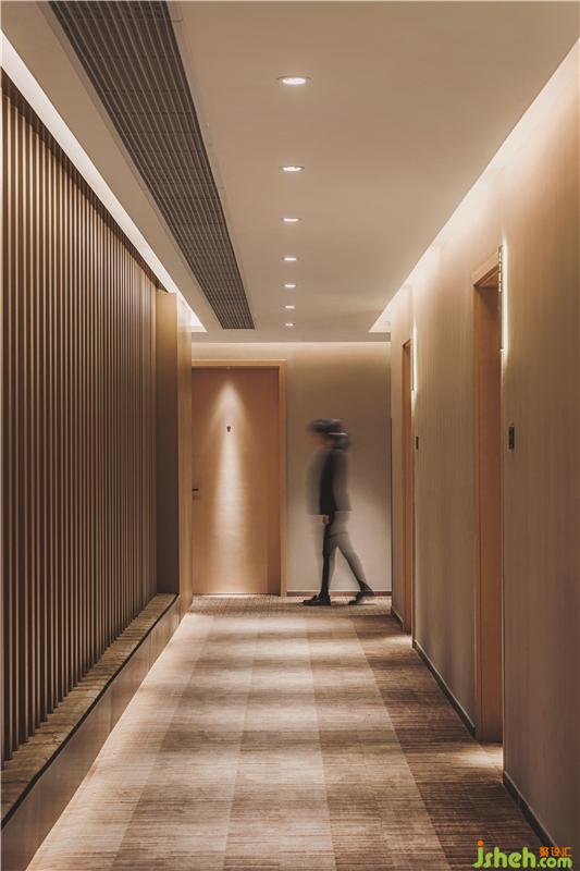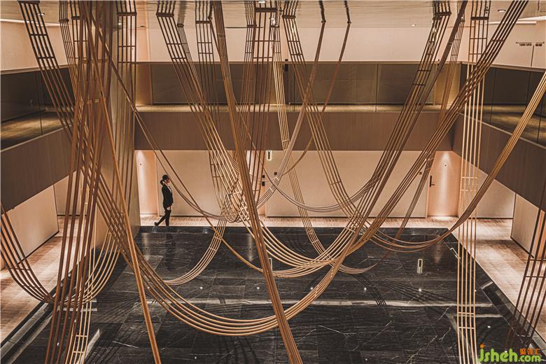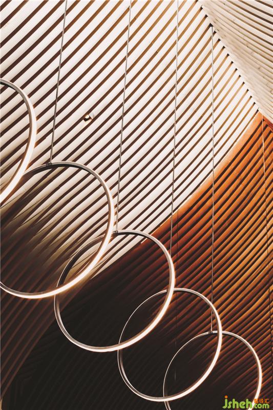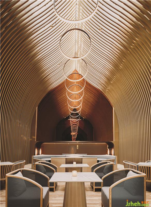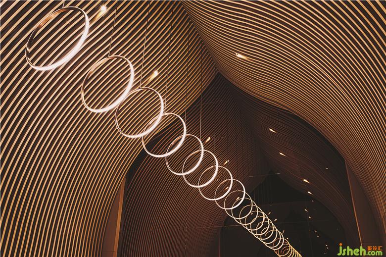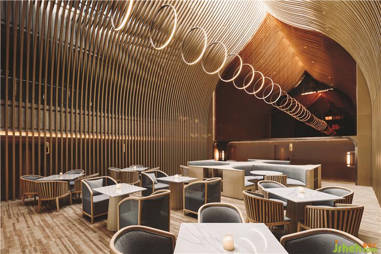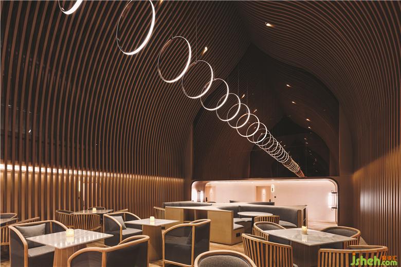 在頂樓的SkyCafé,全高的竹子結構構成了禪宗和教堂般的空間。上方的天窗可以讓白天的自然光落在座位區(qū)的中間。商務酒店設計吊頂懸掛的圓形LED燈形成無盡的發(fā)光月亮,并在夜間為客人提供詩意的體驗。