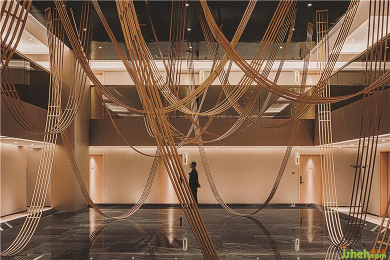 每兩層客房都引入了雙高中央庭院。一個反射性的湖面,竹制的舞蹈曲線自然落下,仿佛在空中漂浮著云朵。這種天花板懸掛結構再次與竹編織大師協(xié)商如何利用其自然彈性和傳統(tǒng)連接方法創(chuàng)建曲線。到達房間前,客人會感覺像穿過一片抽象的竹林。