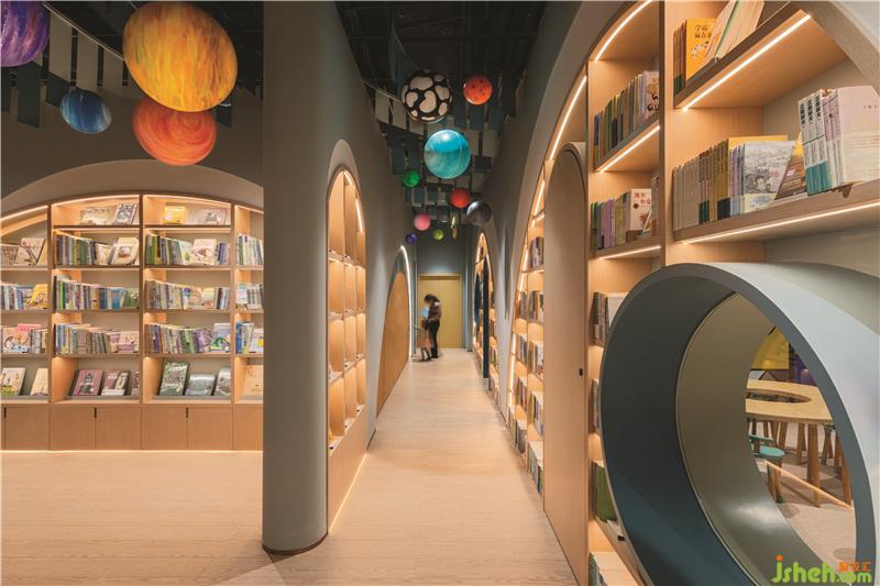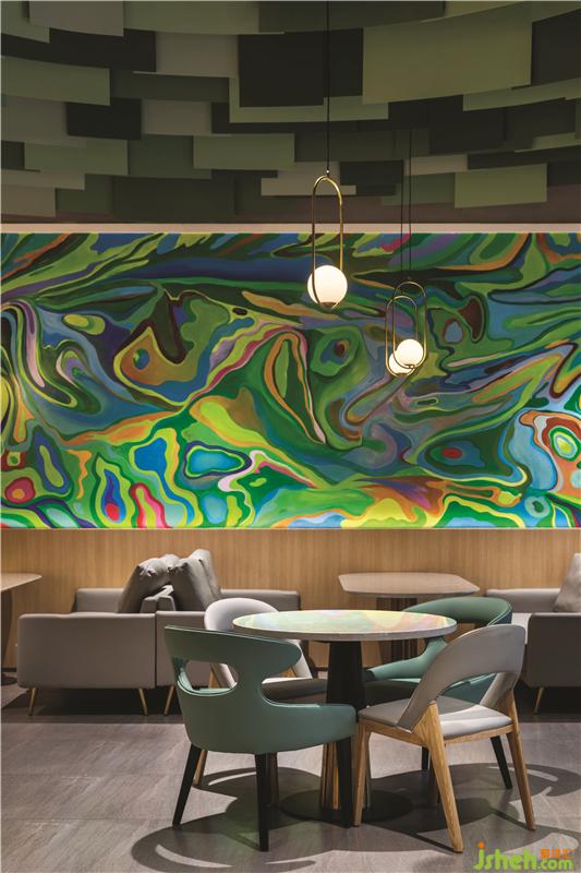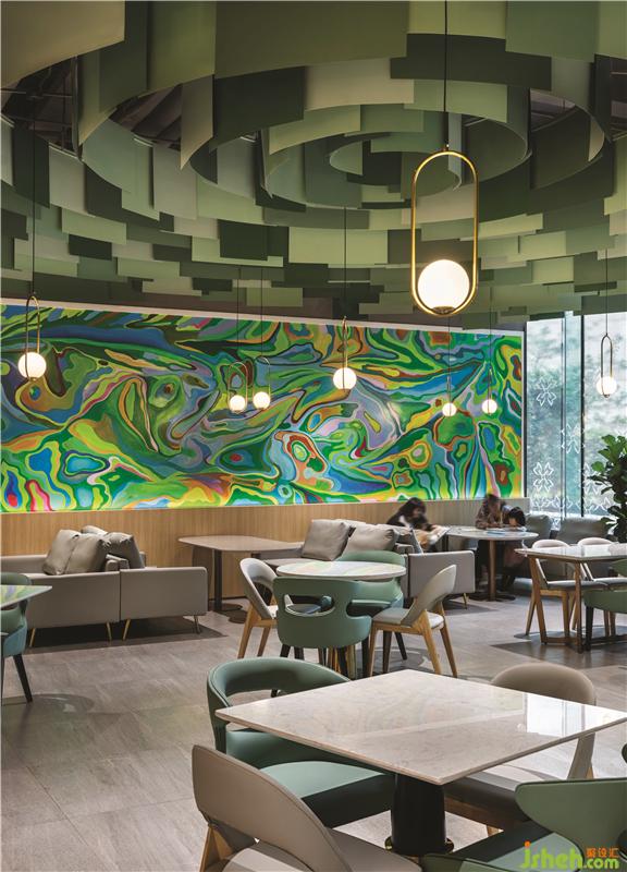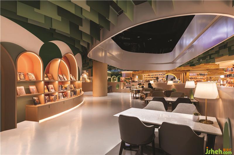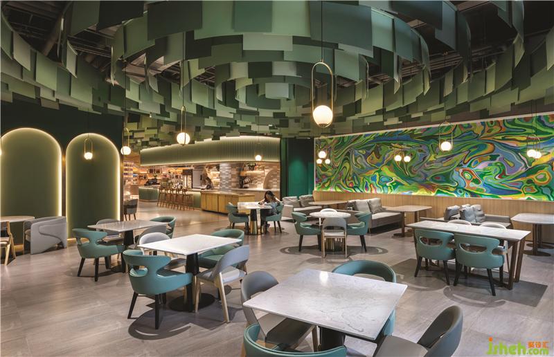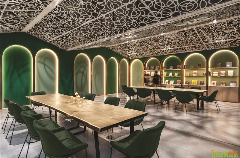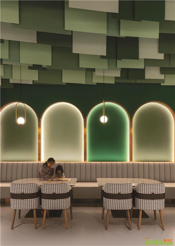 第三個(gè)區(qū)域是綠色調(diào)子的親子餐廳,由三個(gè)不同的功能區(qū)域組成:兒童書店設(shè)計(jì)橢圓劇場(chǎng)周圍的平臺(tái)用餐區(qū),開放式廚房對(duì)面的長椅就座區(qū)以及激光切割白色金屬板制成描繪花園洋房的形狀的VIP區(qū)。