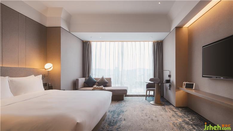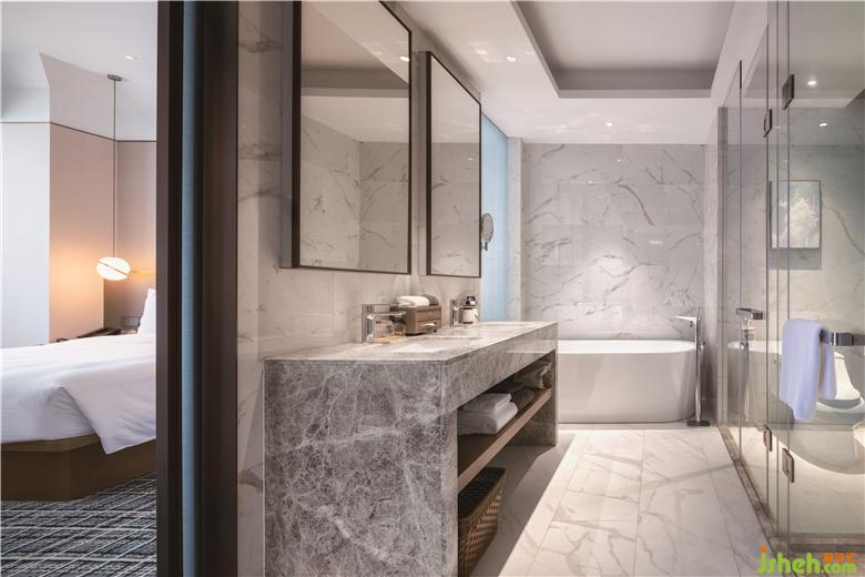 淺灰色的牆壁和天藍色的圖案地毯陪伴著標準樓層走廊和客房中的所有客人。簡潔的造型,床頭板上的暗藏燈槽和白色大理石的半開放式洗手間延續(xù)了整體的簡約美學,旨在為客人提供寧靜祥和的氛圍。