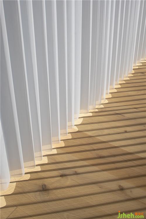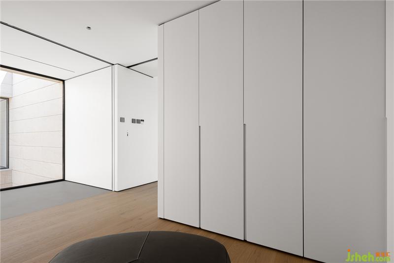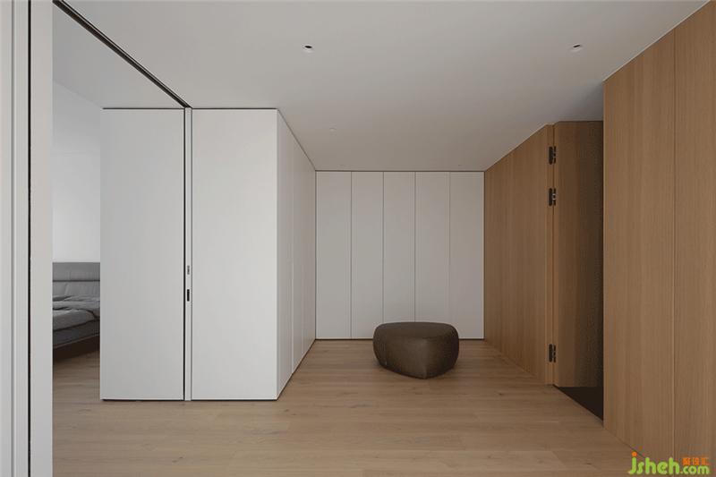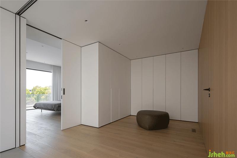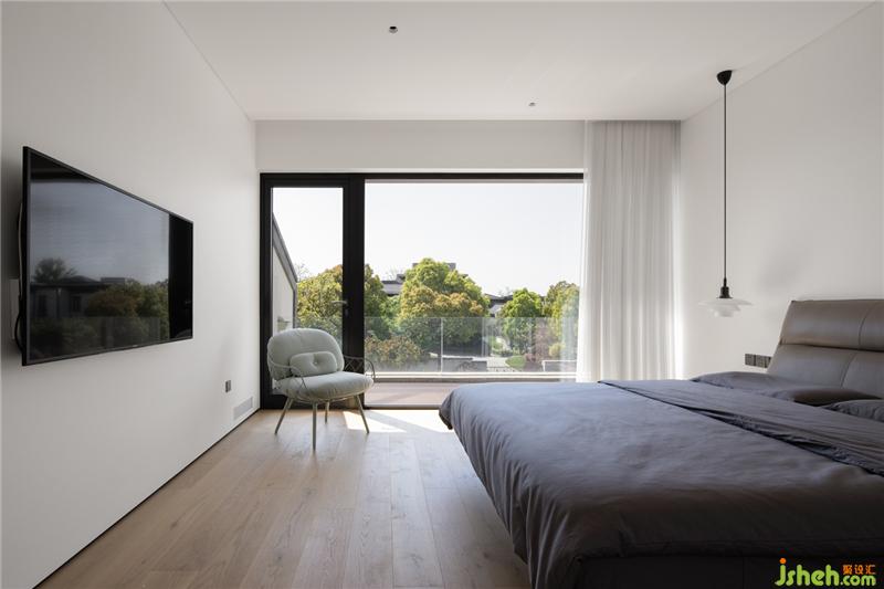 臥室寬大的床上擺放著舒適的床上用品,波浪條紋的窗簾隱隱約約透過(guò)光,設(shè)計(jì)簡(jiǎn)潔的吊燈從頂部垂到床邊,一個(gè)抽象的衣架立在床邊,增加了臥室的藝術(shù)氣息,一切都顯得寧?kù)o舒適。