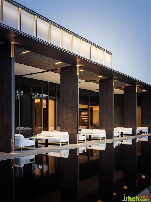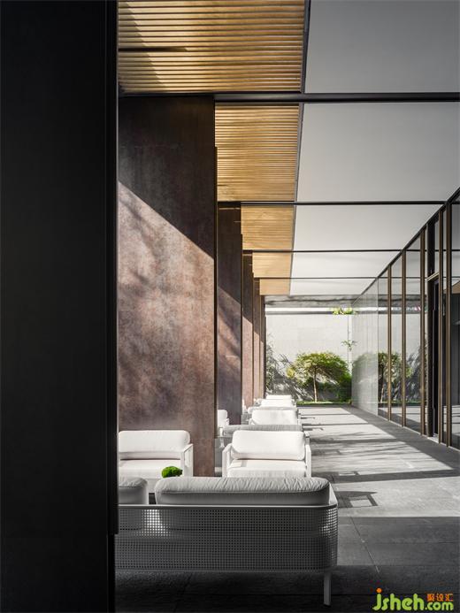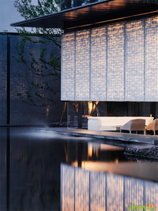 步入建筑,迎接我們的是一場典型的東方體驗,“藝術展廳”奠定了整體一層的空間命題。南京會所設計門廳以精致客廳的面貌傳達強烈的歸屬感,暗示出服務對象的性質。隨著動線轉折,將步調放緩,必經(jīng)路徑上不同的展示內容,沙盤、模型及其他藝術品甚至拾得物皆作為資源融入設計想象,在保持審美統(tǒng)一的前提下層層遞進,為人們到達中心空間的高潮進行鋪墊。南京會所設計建筑表皮垂直方向有韻律的吟唱于展廳空間內部得到了明確的響應,內外體量牢固結合。經(jīng)過反復論證,于?廳中軸線方向增設“覺知亭”與其隔水相望,以一個“點”將空間構圖錨固。