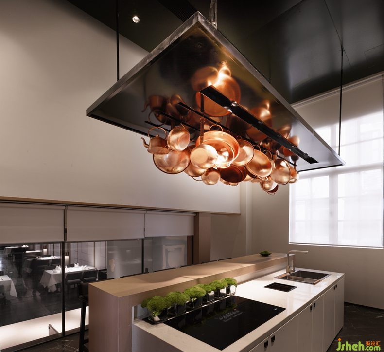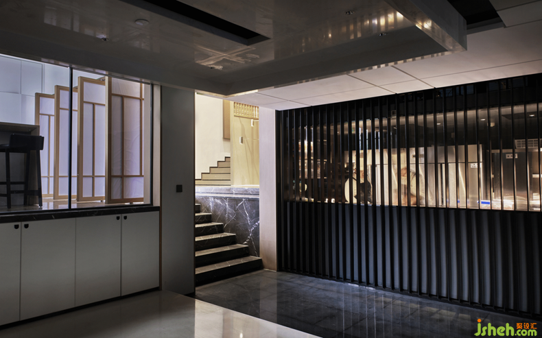 通往半地下一層空間被劃分成開敞式廚房與就餐區(qū),食客與制作者的關(guān)系應(yīng)是互為賞識(shí)的,前提是保有距離,一種互通并不斷保持變化的遠(yuǎn)近關(guān)系,黑色條形鋼板制作的區(qū)間分割面,被設(shè)計(jì)者稱之為“空間面紗”的序列,在食客行走的過(guò)程中,視線不斷被放大,從而發(fā)現(xiàn)食物被制作的過(guò)程當(dāng)是欣喜?!坝X(jué)知”此刻表現(xiàn)為互賞者的心理交流。餐廳設(shè)計(jì)就餐區(qū)的臨窗立面,開窗雜亂之際光的肆意,用宣紙材質(zhì)裱糊出的屏風(fēng)墻,將自然光線進(jìn)行二次過(guò)濾,暈染出糯白的儒雅氣氛,黑與白的沖突美學(xué),一如“面紗”的正反面。