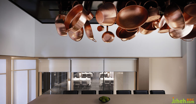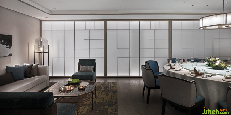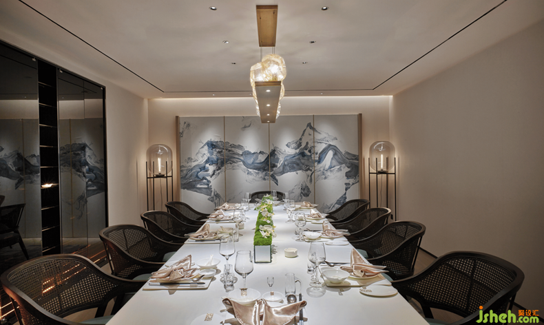 由通道立面設(shè)置的隱框門進(jìn)入,忽然開朗之余更多的是面對(duì)隱逸環(huán)境的興奮與自信,臨窗界面依舊采用宣紙屏風(fēng)將自然光線過(guò)濾并充斥空間,光線照射后的樹影在某個(gè)時(shí)段內(nèi)成為主角與佳肴一同演繹。