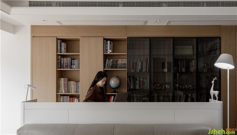 主體大書柜長3280mm,同樣嵌入式的設(shè)計,保證了空間的平整。采用玻璃柜門、木柜門及鏤空柜體協(xié)調(diào)設(shè)計。入戶即映入眼簾,時尚大氣。