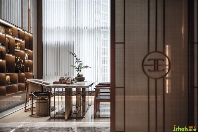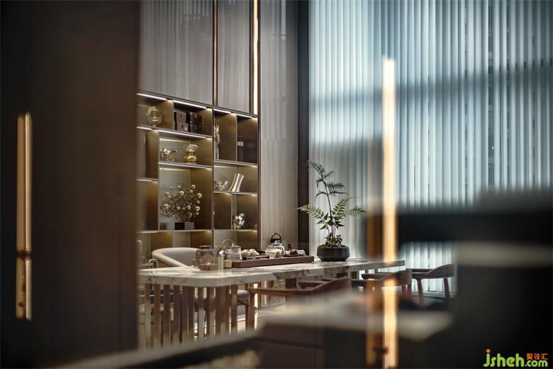 順著玄關(guān)步入茶室區(qū)域,與陽臺(tái)共通,大面積落地窗讓整個(gè)空間被窗外的自然光線所浸透。室內(nèi)頂部及相應(yīng)柜體為相互呼應(yīng)的顏色,用線條感帶動(dòng)整個(gè)空間的靈動(dòng)性,柜子與電視嵌入墻面更顯高級(jí)感。家裝設(shè)計(jì)在茶室設(shè)計(jì)中,推拉門的元素是對(duì)茶室構(gòu)成要素進(jìn)行再設(shè)計(jì),以此展示不同以往的新中式茶室風(fēng)采。