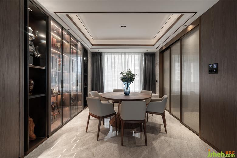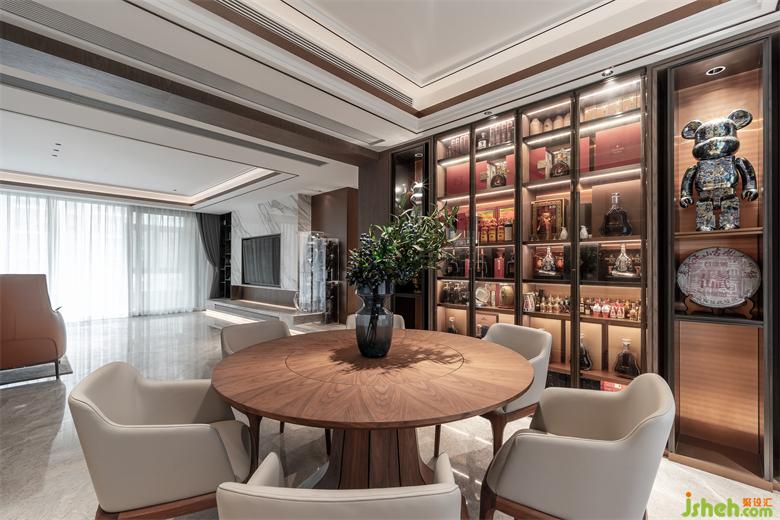 時(shí)下比較流行且受歡迎的木飾面客廳背景墻設(shè)計(jì),搭配明亮色系沙發(fā),是豪宅酒店常用的設(shè)計(jì)手法。家裝設(shè)計(jì)客廳連貫著餐廳,空間兼容性強(qiáng),顏色搭配極佳,呈現(xiàn)出沉穩(wěn)內(nèi)斂的空間調(diào)性。餐桌椅子皆為淺色系搭配原木的款式,儲(chǔ)物柜均采用木色系,顯得頗有文化氣息,為空間釋放不少光澤。