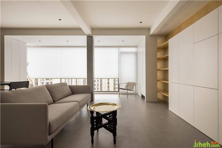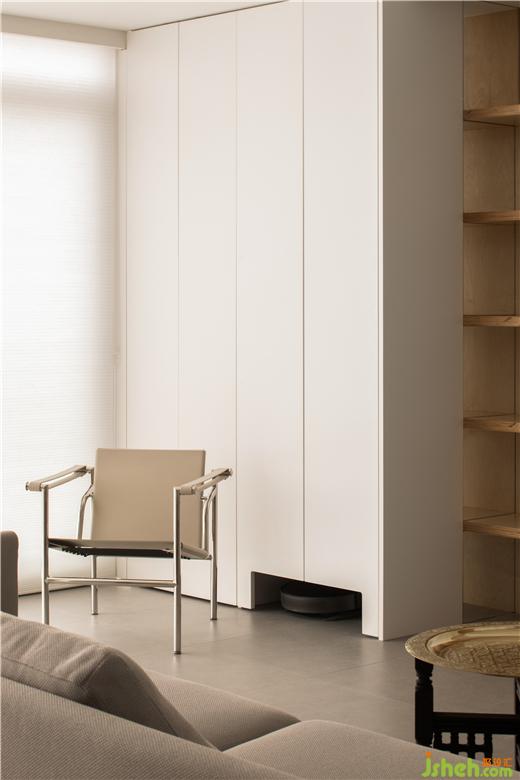 在變大的陽(yáng)臺(tái)做收納,存放家用的一些功能性用具,比如洗衣機(jī)、烘干機(jī)等,拖地機(jī)器人也有專用的“工位”和出入口,這是陽(yáng)臺(tái)的功能之處。但更多的空間是用來(lái)作為起居空間的“余?!?,引來(lái)極佳的光線,也作為視覺(jué)和腳步丈量之用。