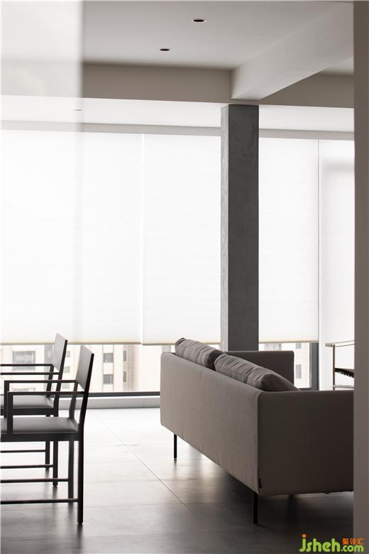 房間的非承重墻體被敲掉后,在公共空間留下了一根布滿細(xì)鋼筋的柱子,大平層裝修設(shè)計(jì)經(jīng)過(guò)粉飾之后意外的有了清水混凝土的效果,伶仃的柱子在這個(gè)地帶雖是樸素裸露的樣子,卻成為了室內(nèi)空間建筑感的來(lái)源。
