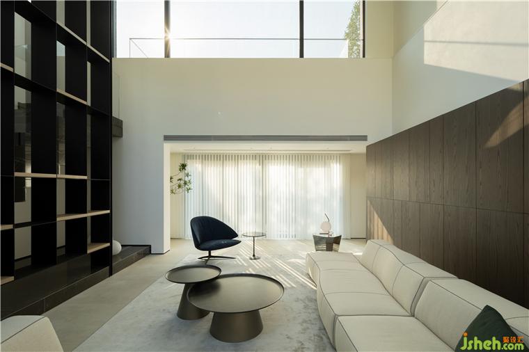 更多的光照了進(jìn)來(lái),層高也變得模糊。倒拱形吊頂下,鏤空的黑色裝飾架縱向延伸,通向一層的樓梯隱藏在其后,作為地下與一層連接通道轉(zhuǎn)化的過(guò)渡,是地下會(huì)客廳的視覺(jué)中心。鏤空的設(shè)計(jì)從地面直達(dá)頂面,木制層板橫向錯(cuò)落,以強(qiáng)烈的比例關(guān)系凸顯大空間尺度,將空間的對(duì)外公共性過(guò)渡至向內(nèi)的私密性。
