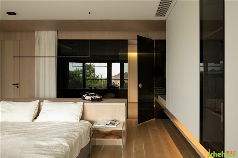 屬于居所的舒適感,適合主人才最重要。臥室作為空間中的空間,核心是維護(hù)人身心的秘密。臥室分布在建筑空間的每一層,位置決定了它們的天然優(yōu)勢。一間引天光入室,藍(lán)天白云作畫,黑色鏡面將外部自然映為墻面裝飾,居于自然。一間有斜面屋頂,層次豐富,灰色點(diǎn)綴白色墻面,獨(dú)享大面積休閑陽臺(tái),居于舒適。又一間色調(diào)降低,功能優(yōu)先,材質(zhì)更加溫暖,居于趣味……以設(shè)計(jì)作為媒介輕微干預(yù),質(zhì)樸的空間在等待主人的進(jìn)入一點(diǎn)點(diǎn)被完善。