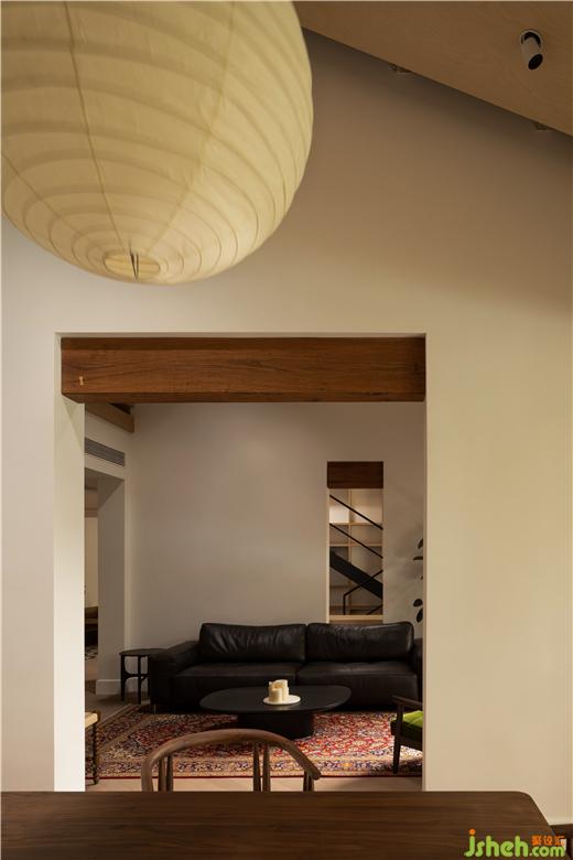 為空間后開的門洞增添形式上的秩序,用老船木去包裹門洞上方結(jié)構(gòu)加固之后多出的梁,比起填平做乳膠漆同化的處理手法,材質(zhì)反差可以產(chǎn)生更加強(qiáng)調(diào)的效應(yīng),這種空間中的層層穿透感是我們想著意突出的。殘舊的老船木被燕尾榫修復(fù)完整,依托舊物改變環(huán)境氣場,物品與空間融為一體相互滋養(yǎng),成為讓人總?cè)滩蛔≡倏匆谎鄣挠≯E。