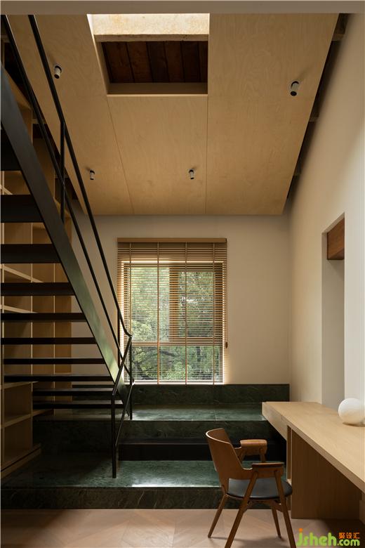 沿著雙坡屋頂?shù)慕Y(jié)構(gòu)做吊頂,是四周留槽的懸空吊頂樣式,在原本天窗處鏤空保留來自頂部的采光。隨著光一起傾泄而下的還有整面的書架墻,顏色素凈結(jié)構(gòu)分明,鋼架結(jié)構(gòu)的樓梯斜著穿插其間,更輕盈通透的建立起樓上樓下連接。