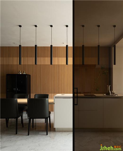 直來直往的公共空間也具有飽滿的層次,吊燈的結(jié)構(gòu)秩序提升空間關(guān)系,餐桌和島臺相融合,中西廚交錯,功能間距近,動線豐富。材質(zhì)成為功能交錯下的調(diào)劑,頂面的藝術(shù)漆,墻面的夾絲玻璃、格柵、石材都有不同的光感,微妙的傳遞變化創(chuàng)造出空間表現(xiàn)力,餐廳直達融合之境。