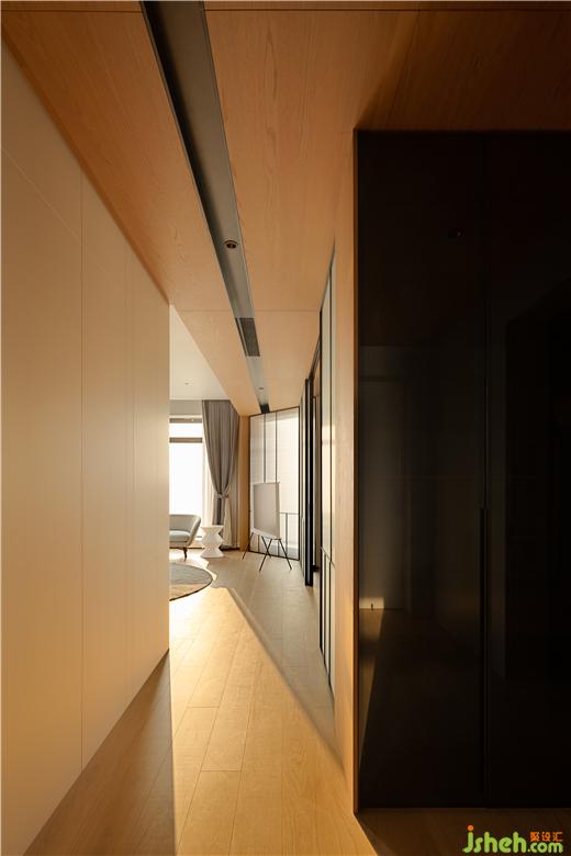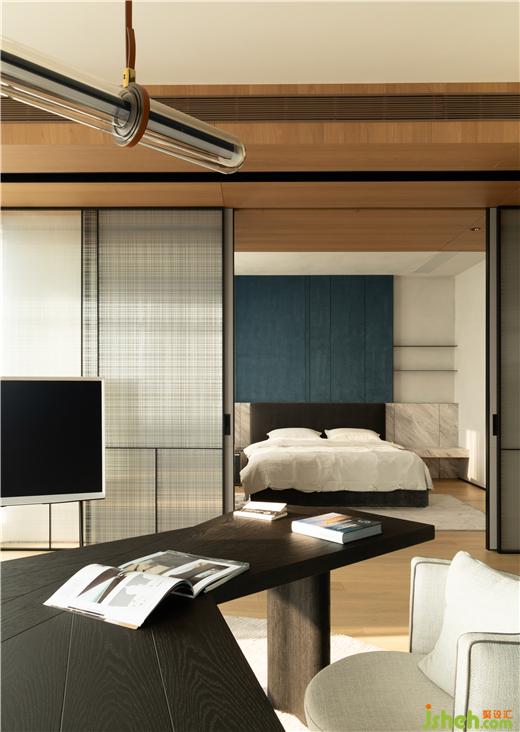 空間中流淌的是縱橫有序的動線,客廳餐廳是橫向串聯(lián)著的,從兩者之間穿過,再無聲息地流向臥室聚集的空間深處,在家時生活伴著不絕江水的悠遠旋律,步履輕松、隨意,沒有一絲緊迫的意思。
