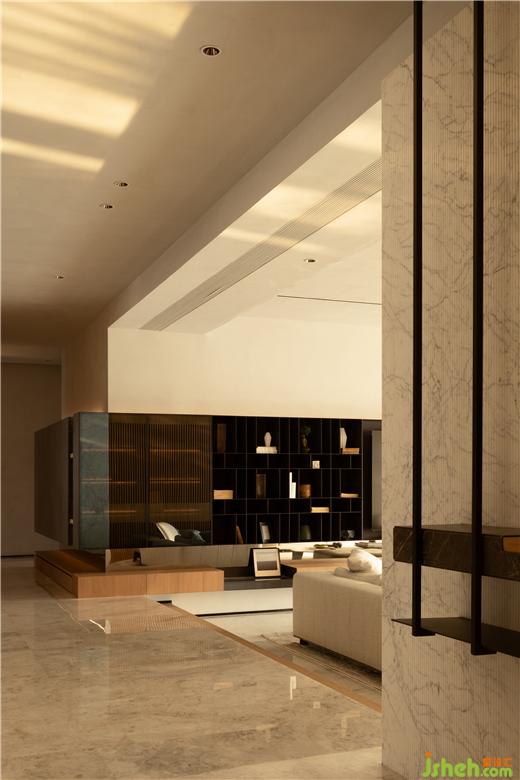 豪宅設計通過關(guān)懷性的設計在客廳建立新的系統(tǒng)和結(jié)構(gòu),從功能拓展出發(fā),水吧作為客廳和陽臺之間的功能過渡,也同時服務于兩者,墻面從木色錯拼格柵開始,豎向的韻律感漸隱至米白色石材之后,減少形式降低變化,將空間提純與漫漫江景相接。
