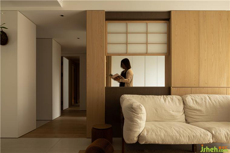 用多個木飾面柜代替不必要的墻體,組合而成的小木屋作為書房及備用房使用,南北向的尺度適當收縮,家裝設計讓通往私區(qū)的走道南移,增強臥室私密性的同時,也巧妙結合了家政區(qū)和外衛(wèi)干區(qū)的功能。